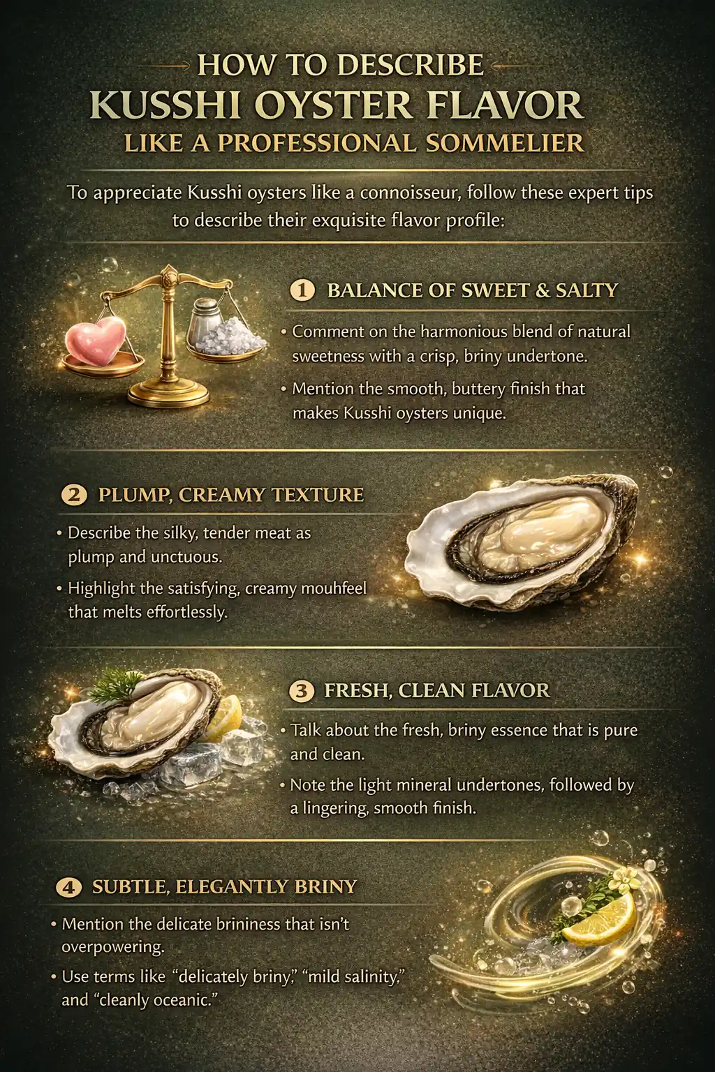 Kusshi oysters are consistent by design. Once you learn to evaluate texture, balance, and finish the way chefs and sommeliers do, their flavor becomes easy to describe—and difficult to mistake for anything else.